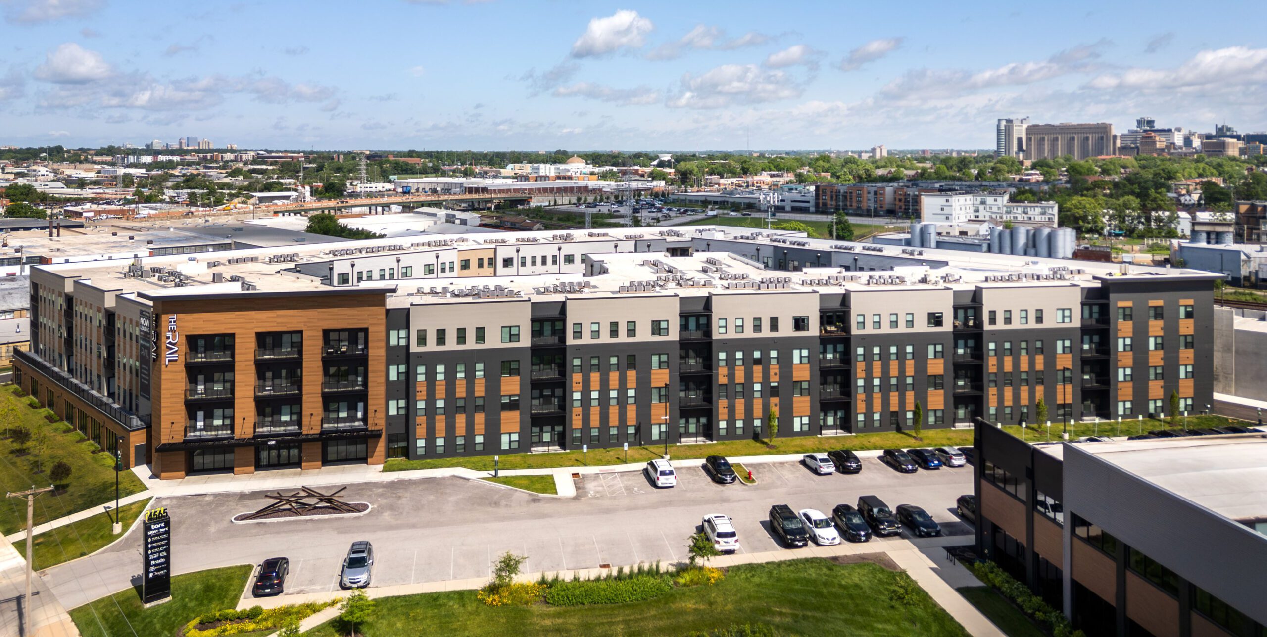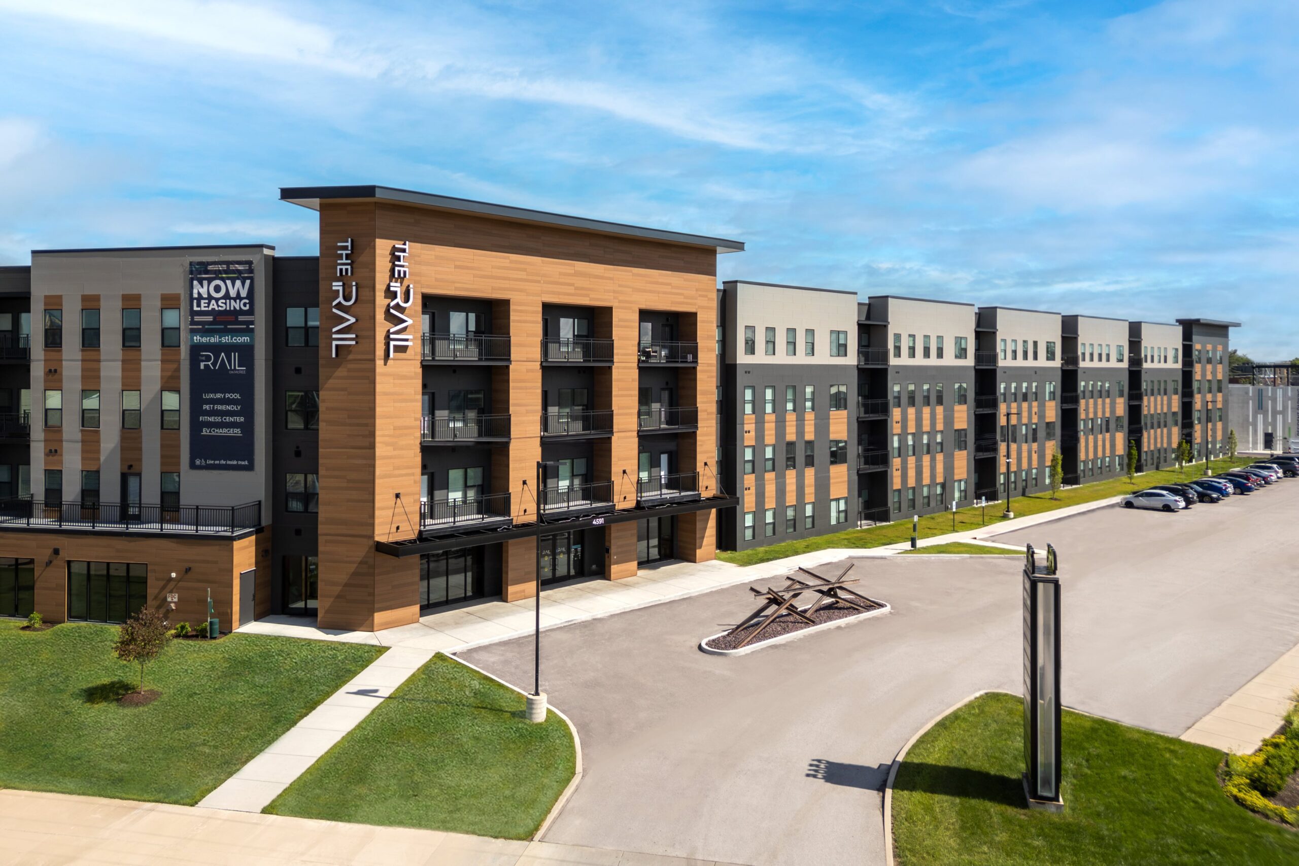 The Rail, located in St. Louis, Missouri is a dynamic multifamily development designed by HDA that redefines urban living. This 278,659-square-foot, four-story building features 268 thoughtfully designed apartments, ranging from studios to one and two bedroom layouts, to accommodate a variety of lifestyles. The development includes a three-level parking garage with a convenient 1:1 parking ratio.